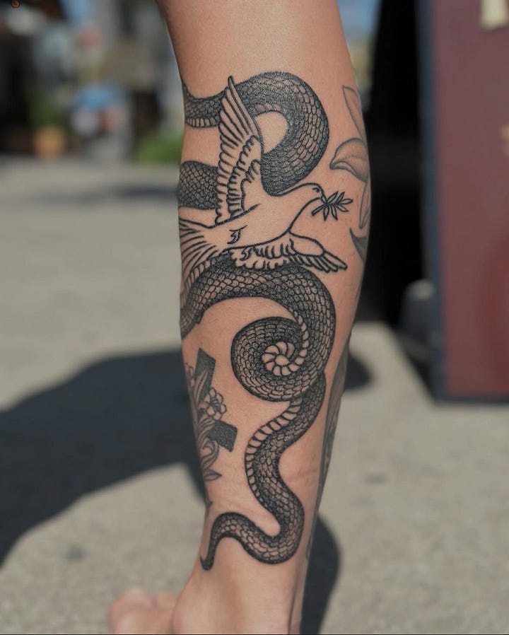 I got tattooed A LOT this year, 12 pieces in total. I have often traveled to the city of the artist to get tattooed, but both Maxime and Henric made trips to LA this year. From Maxime, I got a rose breaking through a skull on the right side of my stomach. From Henric, I got a big snake intertwined with a dove to fill my right calf, referencing an old t-shirt design that we did many years ago.