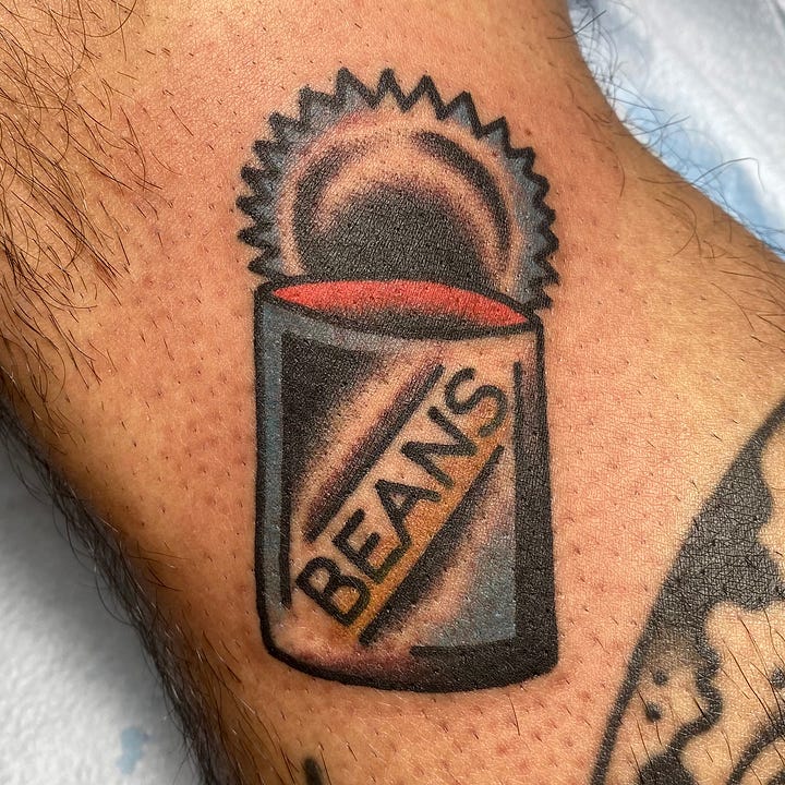 I got a can of beans tattooed on my left shin below my knee. I’m not really the biggest bean fan but I’m not “against” beans per se but I saw the flash and I liked it so it had to be done.