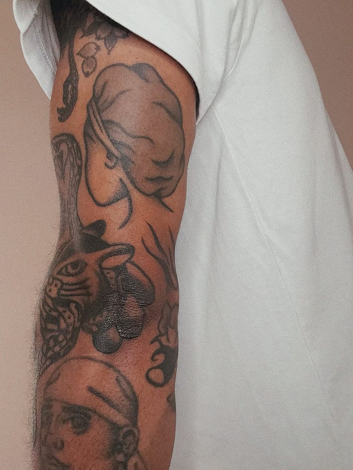 I used to have ideas but now I mostly just defer to the artist and try to get what they're good at or like doing. I have all sorts of different styles—traditional, stick and poke, single needle fine line, etc.—and I have grown to appreciate how they all exist in tension with one another.