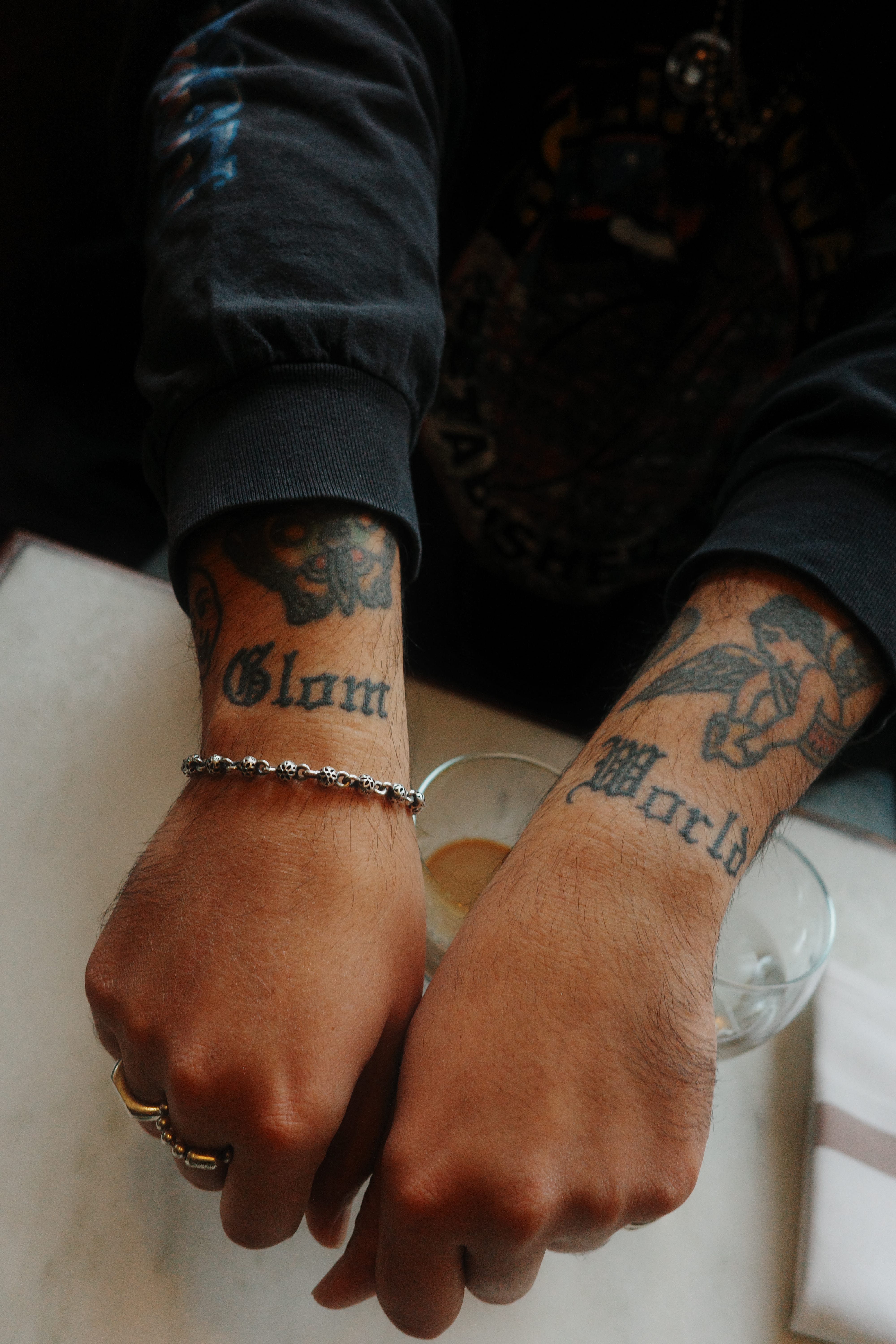 I got GLOM WORLD tattooed on my wrists. My friend Jason Ochoa did one afternoon a year or two ago and then afterwards we played pool.